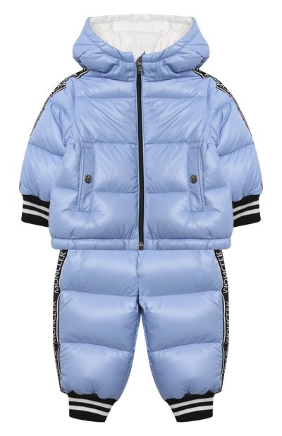 Для пошива небесно-голубого пуховика с глубоким капюшоном и парного комбинезона с широкими лямками использовали фирменный прочный нейлон laque. Материал не промокает, не продувается ветром и легко очищается от загрязнений, а за сохранение тепла отвечает наполнитель из отборного гусиного пуха и пера. Изделия с эластичными полосатыми манжетами декорировали текстильными лентами с паттерном из логотипа.