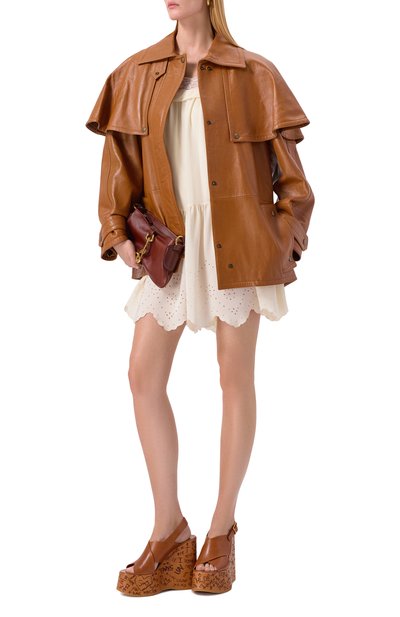 В сезоне осень-зима 2021 года Энтони Ваккарелло представил свою версию парки. Для пошива куртки с отложным воротником и погонами мастера марки, основанной Ивом Сен-Лораном, использовали мягкую эластичную кожу бережной ручной выделки. Из такого же деликатного материала выполнили стилизованную накидку и короткие вставки на рукавах, которые придают модели эффект многослойности. Продетый в кулиску на поясе шнурок, формирует приталенный силуэт.