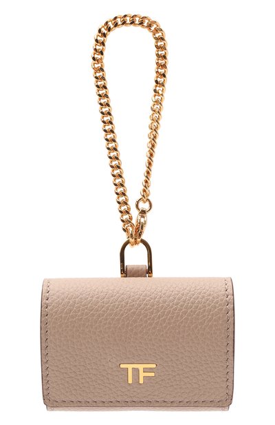 Бежевый брендированный чехол для AirPods Pro выполнили из зернистой матовой кожи. Благодаря фактурному узору на таком аксессуаре меньше заметны случайные царапины и заломы. Модель закрывается прямоугольным клапаном с кнопкой. Цепочка с карабином позволяет прикрепить изделие к сумке или брюкам.