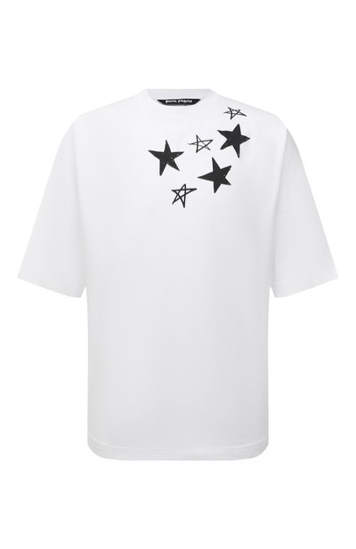 Крупный логотип бренда на белой футболке из коллекции сезона осень-зима гармонично поддерживает мотив в виде звезд, будто нарисованных маркером. Мастера марки сшили модель из мягкого прочного хлопка. Приятный на ощупь материал хорошо пропускает воздух и в сочетании со свободным кроем делает изделие особенно комфортным.