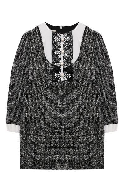 Представленное эксклюзивно в ЦУМе черное свободное платье из мягкого твида на основе хлопка и вискозы выглядит нарядно. Вписаться в праздничную обстановку модели помогает белоснежная манишка с кружевной лентой, украшенной перламутровыми бусинами и серебристой вышивкой.