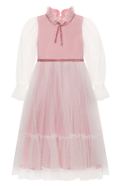 Платье из белоснежного легкого тюля, представленное эксклюзивно в ЦУМе, подойдет для особого случая. Фактурный горох на этом полупрозрачном материале особенно эффектно смотрится на фоне розовой подкладки из тонкого дышащего хлопка. Такого же цвета — узкие бархатные ленты, которыми подчеркнули горловину с воротником-оборкой и линию талии. Модель с длинными рукавами и пышным подолом застегивается перламутровыми пуговицами сзади.