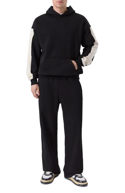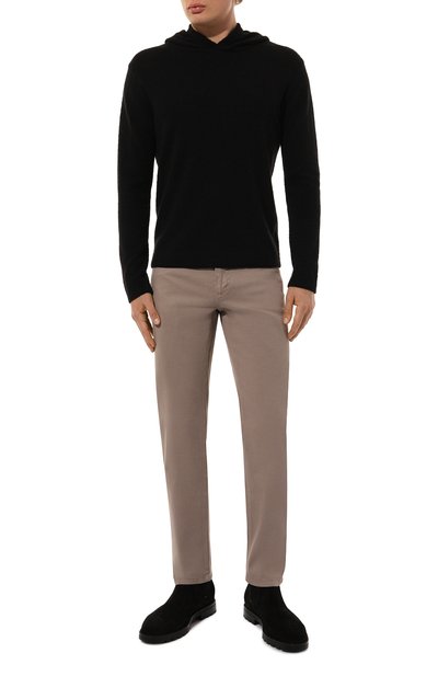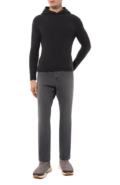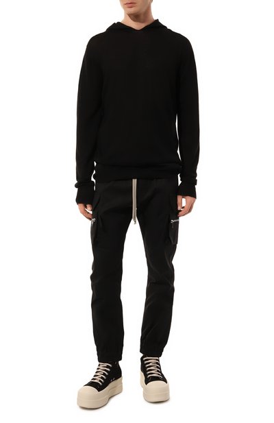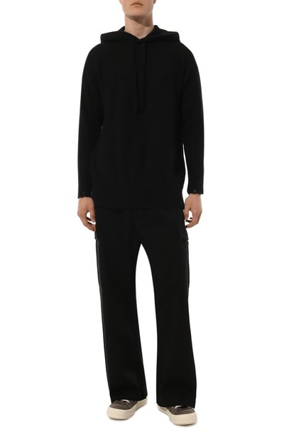 Для изготовления худи с эластичными манжетами и поясом использовали шерстяной трикотаж Super Geelong. Однотонную модель оставили без декора.