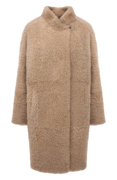 Спокойный бежевый оттенок шубы из коллекции сезона осень-зима только выиграл от фактуры густой короткостриженой овчины. Благодаря тонкой выделке материал получился легким и теплым одновременно, поэтому изделие идеально подойдет для прогулок в холодную погоду. Высокий воротник защищает от ветра.