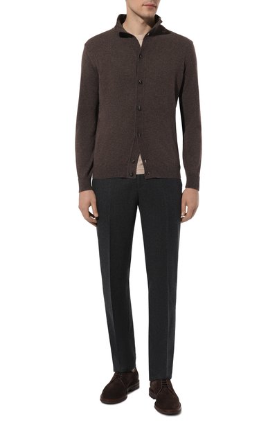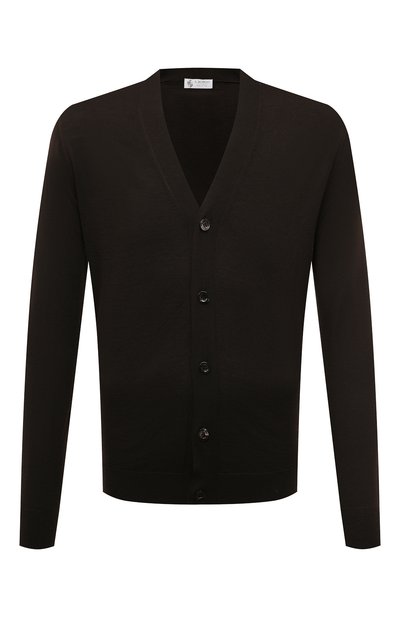 Мастера марки изготовили кардиган оттенка крепкого кофе из тонкой мягкой шерсти. Легкий эластичный трикотаж, связанный простым гладким узором, приятно ощущается на коже, хорошо сохраняет тепло и не сковывает движения, поэтому в модели будет комфортно весь день. Модель с V-образным вырезом застегивается глянцевыми пуговицами в тон.