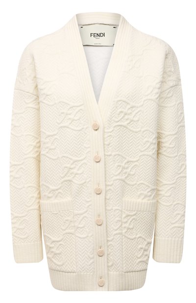 Авторство объемного кардигана молочного цвета легко узнать по узору. В тисненом орнаменте Ким Джонс объединил архивную монограмму Karligraphy и шевронный мотив, который любили сестры Фенди. Для изготовления модели с расслабленным силуэтом мастера марки использовали мягкий материал с тонкой шерстью и нежным кашемиром. Изделие вошло в осенне-зимнюю коллекцию.