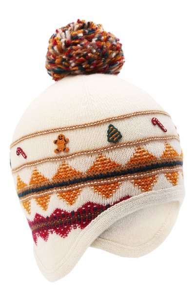Мастера марки связали белую шапку с ярким жаккардовым орнаментом из нежнейшего кашемира. Изделие из такого материала особенно хорошо сохраняет тепло, но не перегревает, поэтому в нем будет комфортно и в морозную погоду, и в оттепель. Модель декорировали крупным помпоном и миниатюрными разноцветными нашивками в виде сладостей.