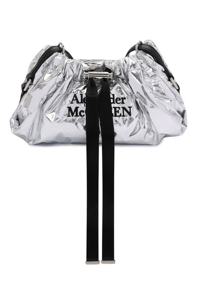 Металлизированная сумка The Bundle из осенне-зимней коллекции бренда, основанного Александром Маккуином, умело справляется с многозадачностью: такой аксессуар можно носить как кроссбоди, а спрятав узкий плечевой ремень ‒ и как клатч. Модель из мягкого легкого текстиля, который драпируется объемными складками, украсили вышитым логотипом марки.