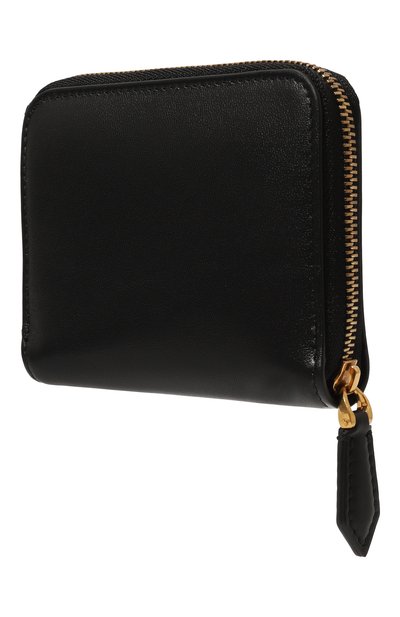 Компактное черное портмоне выполнили из прочной мелкозернистой кожи, устойчивой к появлению потертостей и царапин. Переднюю панель украсили золотистой архивной монограммой Double G и фигурной накладкой из обожженного полированного бамбука. В аксессуаре, закрывающемся на кнопку, предусмотрели четыре слота для пластиковых карт, отделение для купюр и карман с молнией для монет.