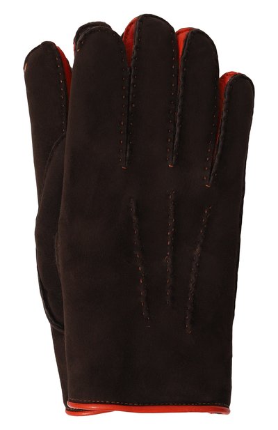 Для пошива темно-коричневых перчаток с подкладом из овчины команда бренда использовала комбинацию пластичной бархатистой замши и гладкой прочной кожи, окрашенной в контрастный оранжевый оттенок. Ею укрепили детали: межпальцевые швы, узкий кант и миниатюрную кнопку, которой застегивается манжета.