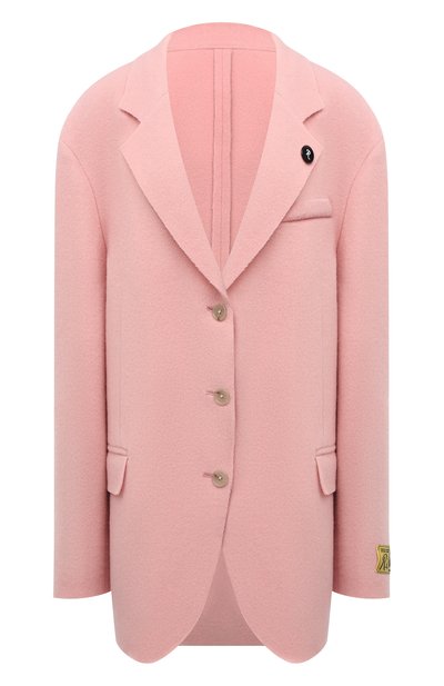 Несмотря на светло-розовый цвет пиджак из осенне-зимней коллекции не выглядит по-девичьи романтично. Раф Симонс снизил рафинированность пастельного оттенка за счет свободного силуэта и необработан ных краев изделия. Дизайнер выбрал для пошива модели легкую мягкую шерсть с добавлением пушистых нитей нежного мохера.