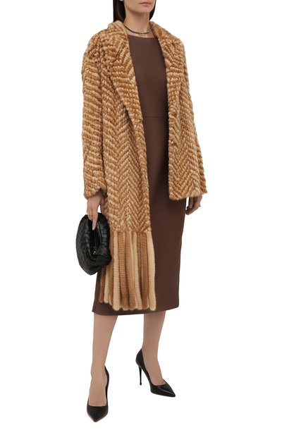 Модель с шубе кремового оттенка открывала показ осенне-зимней коллекции, ставшей для Кима Джонса дебютом в бренде, основанном супругами Фенди. Для пошива модели с пышными рукавами и объемным отложным воротником, как у викторианского платья, использовали шелковистый мех норки. Отделку выполнили из мягкого меха козлика и бархатистой замши. Приталенный силуэт формирует пояс с пряжкой в виде FF-монограммы.