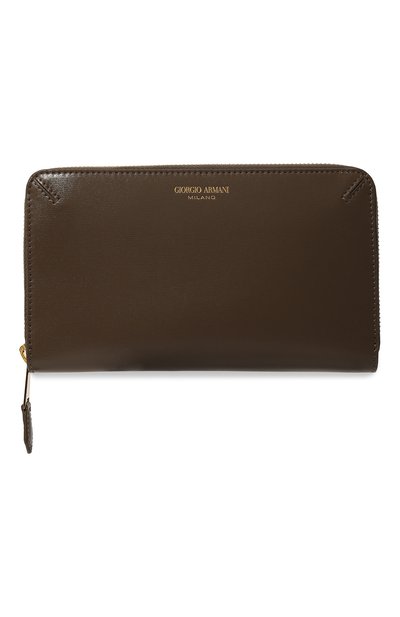 Для изготовления темно-коричневого кошелька, застегивающегося круговой молнией, мастера марки использовали мягкую фактурную кожу. Блеск отполированного материала поддержали золотистым тисненым логотипом бренда на передней панели. Внутри – слоты для кредитных карт, отделения для купюр и чеков, а также разделительный карман для монет.