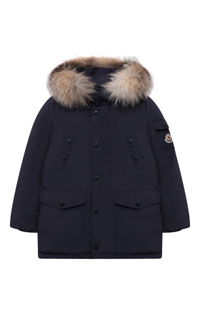 Темно-синюю парку сшили из плотного полиэстера, на ощупь напоминающего хлопок. Материал не боится моросящего дождя и снега, а утеплитель из пуха и пера поддерживает комфортную температуру, не утяжеляя изделие. Для максимального эффекта модель дополнили капюшоном со съемным пушистым мехом песца. Единственным акцентом стал знаковый фетровый патч, которым подчеркнули карман на левом рукаве.