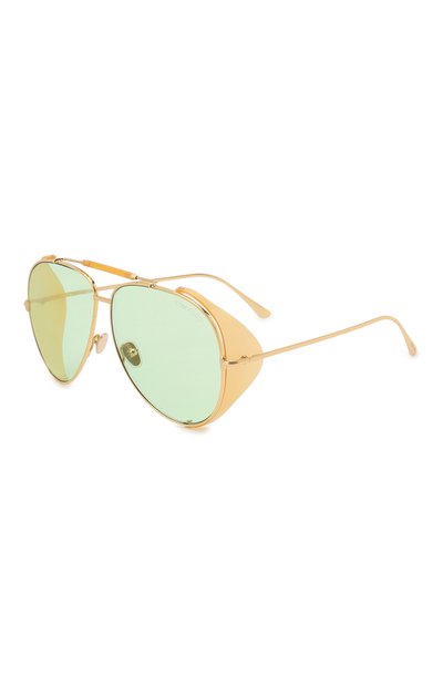 Эти авиаторы утратили привычную строгость, и дело не только в лаймовом оттенке линз со 100-процентной защитой от ультраф иолета. Новое звучание придают полупрозрачные лимонно-желтые шоры, с которыми рифмуется накладка на двойном мосте. Неизменными остались отточенный силуэт и узкая оправа из легкого металла.