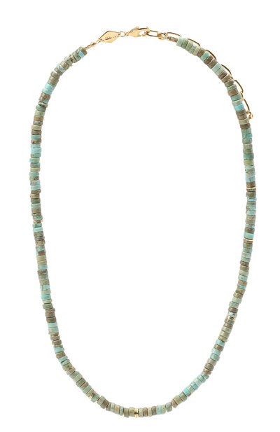 Короткое колье одинаково гармонично впишется как в повседневный образ с джинсами и футболкой, так и в коктейльный наряд. Правильное настроение задают миниатюрные плоские диски из отполированной бирюзы голубого, серого и зеленого оттенков. Их пастельную гамму разбавили вставками из легкого ювелирного сплава, покрытого тонким слоем 18-каратного золота.