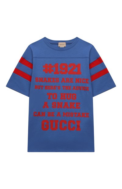 Свободная синяя футболка заявляет о своей принадлежности бренду с помощью контрастного принта спереди: его дополнили годом основания бренда. Для пошива модели комфортного прямого кроя использовали дышащий хлопок джерси, который хорошо пропускает воздух и тянется, не сковывая движения даже во время активных игр.