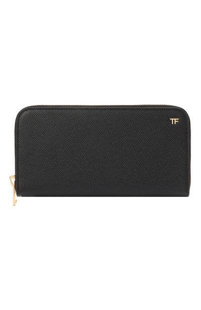 Для пошива черного кошелька использовали прочную кожу с тисненым мотивом и тонким глянцевым покрытием, которые защищают от царапин и потертостей. Внутри для удобной организации пространства аксессуар разделили пополам карманом на молнии и в каждом отделе предусмотрели отсеки и слоты. Изделие украсили позолоченной деталью в виде инициалов Тома Форда.