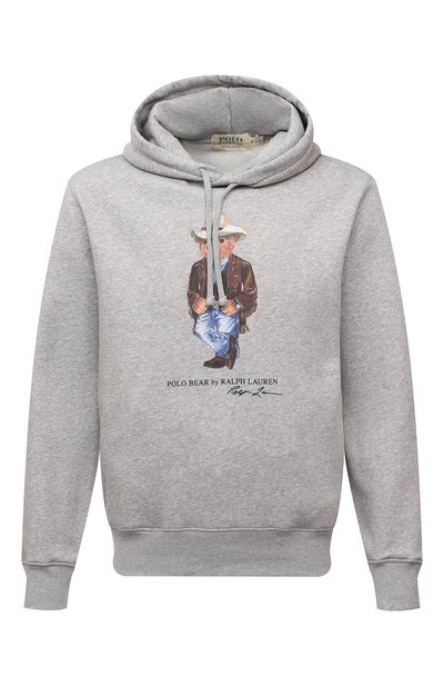 Знаковый медведь Polo Bear на этом худи напоминает владельца ранчо. Тон задает наряд в духе линии одежды RRL, который отсылает к одноименным владениям Ральфа Лорена в Колорадо. Идеальным фоном для цветного принта стал меланжево-серый трикотаж на основе хлопка. У мягкого материала фактурная изнанка, поэтому в модели из весенне-летней коллекции будет уютно в прохладный день.