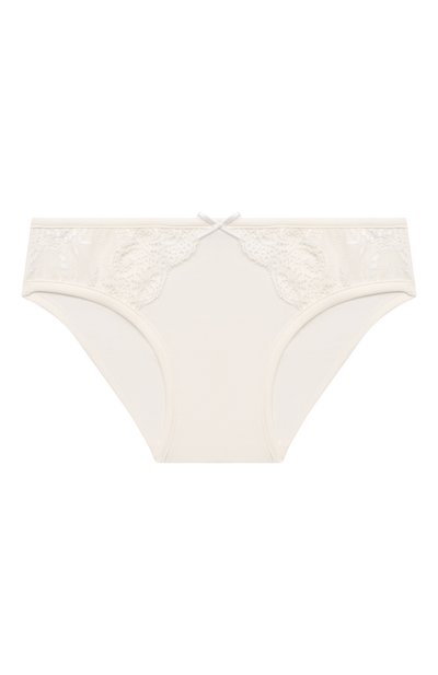 Для пошива этих кремовых слипов команда марки выбрала разные по фактуре, но одинаково мягкие и нежные материалы. Тонкий эластичный трикотаж из отборного хлопка почти не ощущается на теле и оттеняет ажурный узор на накладках из искусного кружева. Трусы украшены миниатюрным бантом из сатиновой ленты.