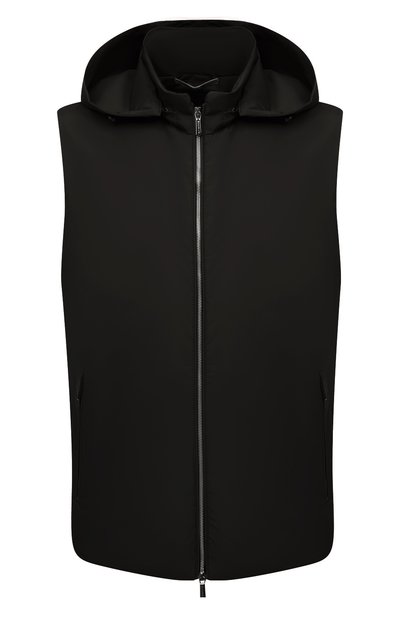 В паре с поло черный жилет из весенне-летней коллекции 2022 года будет удачным решением для прохладного дня и позволит чувствовать себя комфортно в мороз, если надеть его под утепленную одежду. Модель из прочного полиэстера получилась легкой и тонкой, поэтому почти не ощущается на теле, но защищает от ветра и моросящего дождя. Для большего эффекта предусмотрел и съемный регулируемый капюшон.