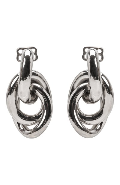Серьги с застежками-пусетами в форме шурупов не останутся незамеченными. Правильный характер модели задают съемные подвески в виде переплетенных колец. Мастера марки выполнили аксессуар из легкого ювелирного сплава с глянцевым гальваническим покрытием серебром.