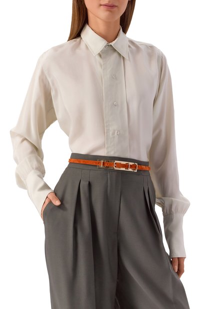 Темно-серый узкий ремень Oval Buckle выполнили из особенно мягкой и при этом прочной бархатистой замши из выделанной вручную телячьей кожи. Аксессуар регулируется крупной тонкой пряжкой, овальную форму которой подчеркнули гильошированным узором. С деликатным декором на фурнитуре перекликаются знаковые цепочки мониль на тренчике.