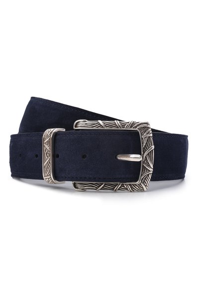 Несмотря на лаконичный темно-синий цвет этот ремень стандартной ширины — вариант не для формальных брюк. Более брутальным аксессуар делают серебристые пряжка и шлевка с крупной гравировкой, которую подчеркнули чернением. Для изготовления модели использовали мягкую фактурную замшу.
