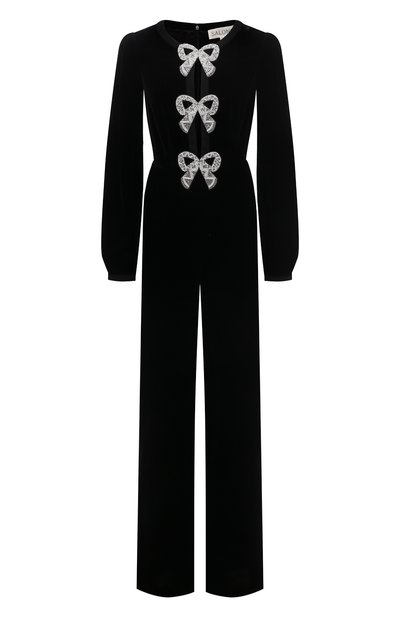 Сдержанный черный цвет комбинезона из весенне-летней коллекции Салони Лодха компенсировала материалом и декором. Мастера марки сшили модель с длинными рукавами из мягкого плотного бархата, укрепленного нитями шелка. Изделие спереди украсили прорезями, подчеркнутыми аппликациями в форме бантов, расшитых мерцающими стразами, бусинами и бисером.