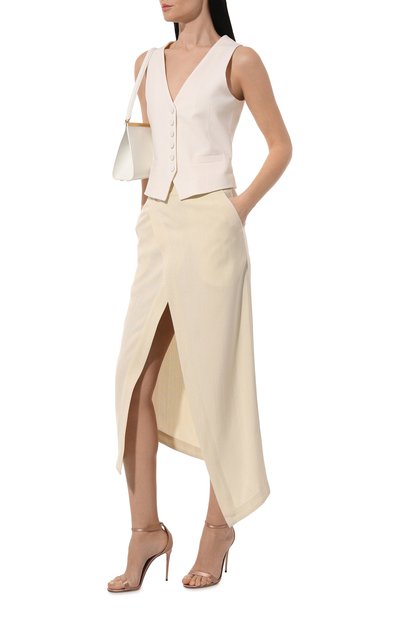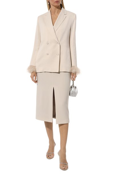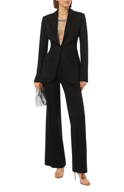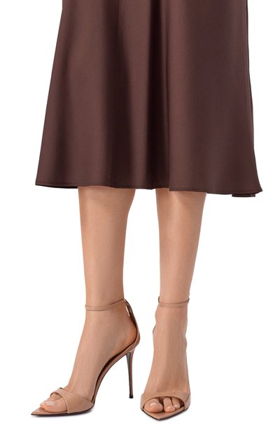 Босоножки на шпильке выполнили из гладкой лакированной кожи. Перекрещивающиеся на союзке перемычки из прозрачного плексигласа делают пару почти незаметной на ноге. Модель застегивается на щиколотке узким ремешком с пряжкой-эмблемой.