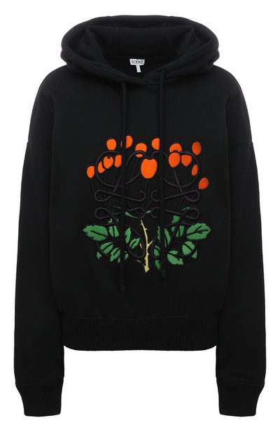 За гроздью спелого шиповника на этом худи почти не разглядеть крупной эмблемы бренда, основанного Энрике Лоэве. Анаграмма так тесно переплелась с аппликацией, что кажется, будто яркие плоды созрели прямо на вышитых литерах L. Свободный крой и мягкий черный трикотаж не отвлекают внимание от искусного декора. Модель с уютной фактурной изнанкой вошла в круизную коллекцию.
