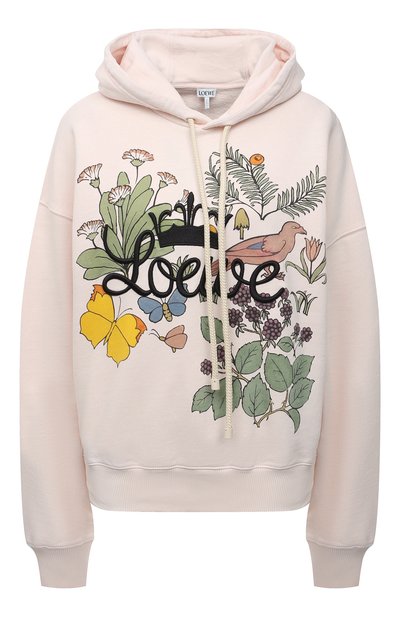 Любовь к природе вдохновила Джонатана Андерсона на создание ярких мотивов с изображением птиц, цветов и насекомых. Таким крупным принтом, дополненным вышивкой логотипа, дизайнер украсил свободное бледно-розовое худи из весенне-летней коллекции. Мастера марки, основанной Энрике Лоэве, сшили модель из мягкого трикотажа на базе дышащего хлопка.