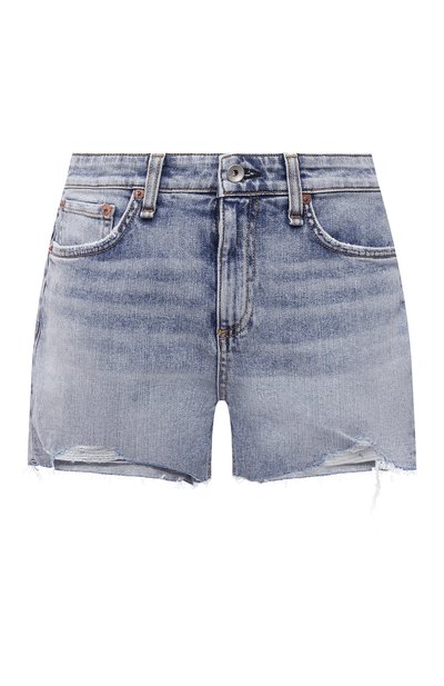 Короткие голубые шорты выглядят так, будто раньше они были джинсами, которые обрезали вручную, оставив края необработанными. Для пошива изделия с крупными потертостями мастера марки использовали тонкий мягкий хлопок. Модель вошла в коллекцию сезона весна-лето.