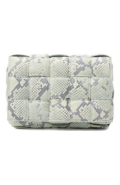 В коллекцию сезона весна-лето вошло несколько новых версий сумки Padded Cassette. Среди них эта бледн о-голубая модель из мягкой кожи с принтом и тиснением под змею. Широкие ленты этого материала, словно выцветшего со временем, традиционно переплели в фирменной технике intrecciato, создав узнаваемый геометрический узор. В аксессуар с регулируемым по длине ремнем поместятся смартфон, кошелек и футляр с ключами.
