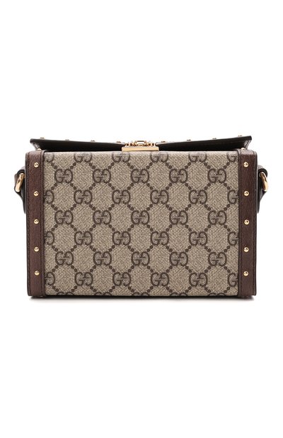 В коллекцию Aria, посвященную 100-летию бренда, вошла бежевая сумка Trunk с регулируемым плечевым ремнем. Для изготовления модели с отделкой из зернистой кожи Алессандро Микеле выбрал прочный канвас со знаковым паттерном GG Supreme, в котором зашифрованы инициалы Гуччио Гуччи. Несмотря на небольшие размеры в аксессуаре прямоугольной формы поместятся и телефон, и ключи, и картхолдер.