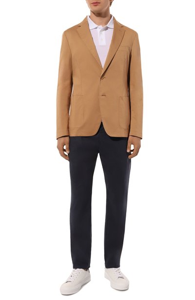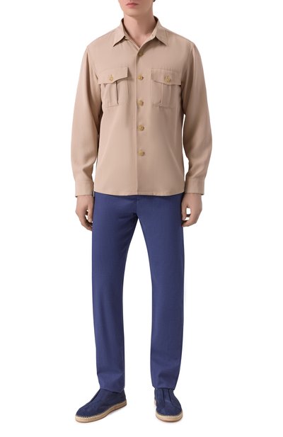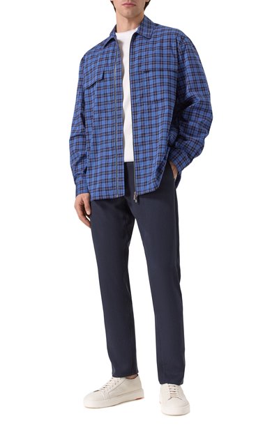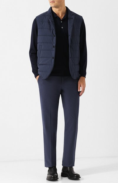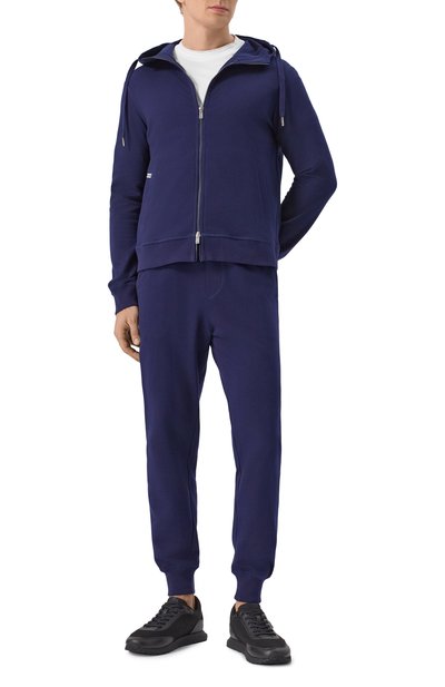 Для создания джоггеров с прошитыми стрелками использовали пряжу на базе хлопка и кашемира. Модель свободного кроя дополнили эластичным поясом и манжетами по низу.