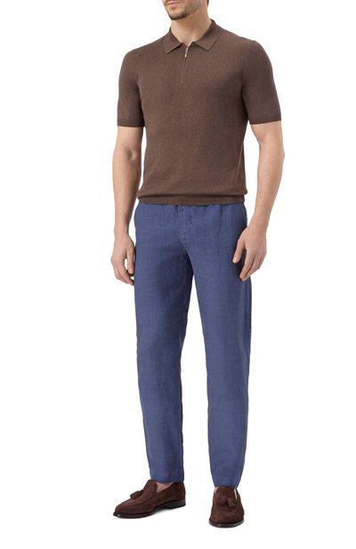 Коричневое поло с короткими рукавами выполнено из мягкого хлопкового пике, которое хорошо пропускает воздух, не пилингуется и слегка тянется, не ограничивая движения. Вырез и воротник отделаны тонким серым кантом. Наши стилисты предлагают сочетать лаконичную модель с лоферами в тон и белыми джинсами.