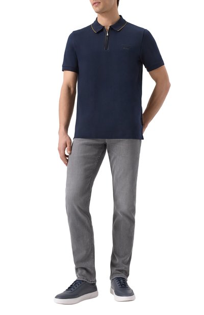 Темно-синее поло из весенне-летней коллекции сшито из легкого сетчатого хлопка пике, который особенно хорошо пропускает воздух. Мерсеризация сделала нити материала не только очень прочными, но и необыкновенно гладкими, поэтому модель мягко блестит в лучах света, а при прикосновении кажется шелковой.