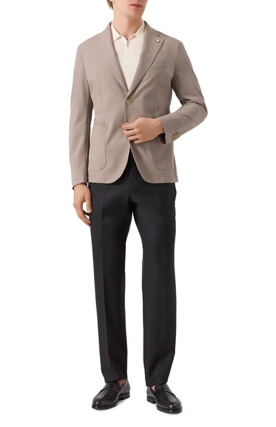 Бежевый однобортный пиджак с тремя накладными карманами может поспорить в комфорте с кардиганом — для пошива модели мастера марки, основанной братьями Канали, использовали эластичный трикотаж из дышащего хлопка, усиленного шелковистым полиэстером. Изделие, выполненное без подклада, садится точно по фигуре и не ограничивает движения.