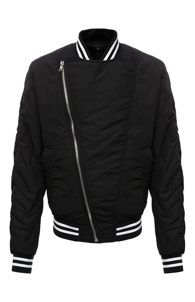 Оливье Рустен привил черному бомберу с двумя карманами гены косухи, заменив обычную молнию диагональной. Для пошива утепленной модели из коллекции сезона весна-лето использовали легкий гладкий нейлон, который не боится ветра и влаги. Воротник-стойка, манжеты и широкий пояс по традиции выполнены из эластичного трикотажа с белую полоску.