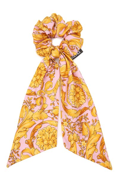 У этой резинки есть все шансы стать стилеобразующей деталью: аксессуар из тонкого шелкового твила стилизовали под платок, который повязали на хвост. Вывести яркость на максимум получилось с помощью знакового архивного принта, придуманного Джанни Версаче.