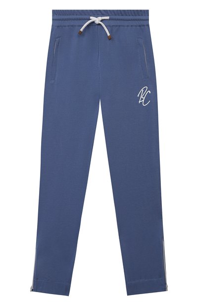 Синие брюки обеспечат комфорт во время длительных прогулок. Посадку удобно регулировать с помощью плетеного шнура, продетого в эластичный пояс-кулиску, а благодаря мягкому хлопковому трикотажу в изделии не будет жарко. Боковые панели дополни ли высокими молниями.