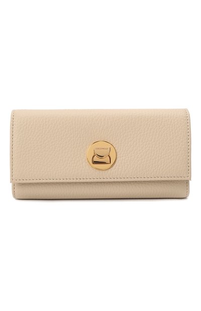 Кремовый кошелек застегивается поворотным замком, как у знаковых сумок Liya. Под откидным клапаном предусмотрели все для удобной организации пространства: карман для монет, отсек для банкнот, 12 слотов и три отделения для чеков и документов. Аксессуар сшили из особенно прочной мерейной кожи, которая меньше гладкой боится потертостей и царапин.