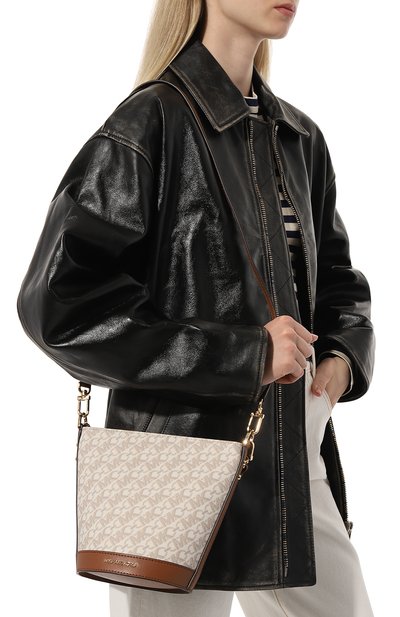 Для пошива сумки Jet Set Charm кремового оттенка использовали плотный брендированный текстиль с защитным полиуретановым покрытием. Плавный силуэт аксессуара подчеркнули контрастным кожаным кантом, который рифмуется с длинным пуллером золотистой молнии. Она, в свою очередь, перекликается с миниатюрным логотипом на передней панели и короткой ручкой-цепочкой.