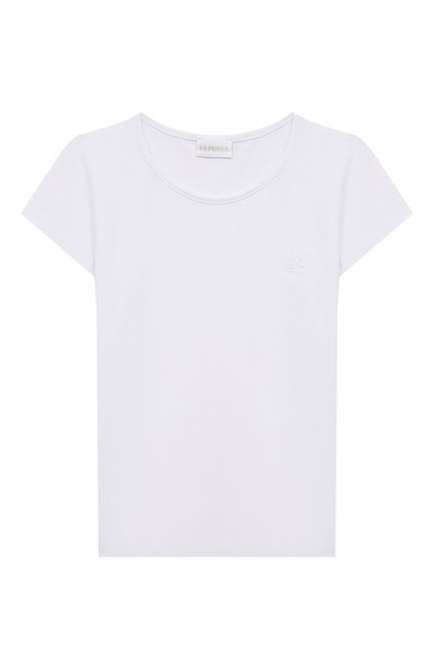 Однотонная молочно-белая футболка выполнена из мягкого эластичного хлопка джерси. Шелковистый материал хорошо пропускает воздух, а крой не ограничивает свободу движений. Легкая модель с короткими рукавами и круглой горловиной украшена вышитым логотипом марки.