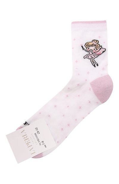 Легкие белые носки из мягкого мерсеризованного хлопка отлично пропускают воздух и впитывают испарени я тела. После опаливания шелковистые нити становятся прочнее, поэтому изделие не растягивается и не пилингуется после стирки. Аксессуар с плоским усиленным швом на мысе украшен мерцающими узорами.