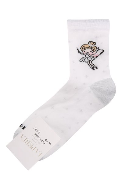 Белые носки с романтичным изображением феи не вызовут раздражение даже на чувствительной коже. Секрет особой нежности ‒ в гипоаллергенном мерсеризованном хлопке, который в гладкости спорит с шелком. Металлизированные нити придали крошечным звездам серебристый блеск, а эластановые волокна усилили тонкий трикотаж, поэтому изделие не боится частых стирок.