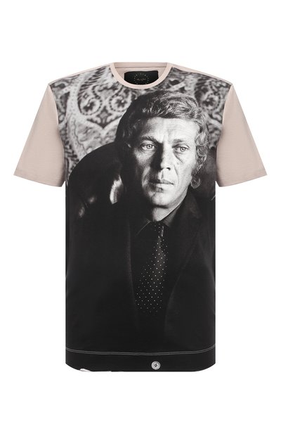 Дизайнерам марки нравится украшать одежду принтами работ известных фотографов. Эту бежевую футболку, выпущенную лимитированной серией, декорировали фотопортретом Стива Маккуина авторства Терри О'Нилла. Для пошива модели с короткими рукавами использовали мягкое дышащее джерси из мерсеризованного хлопка. Изделие из такого шелковистого материала с деликатным блеском приятно ощущается на теле и долго выглядит как новое.