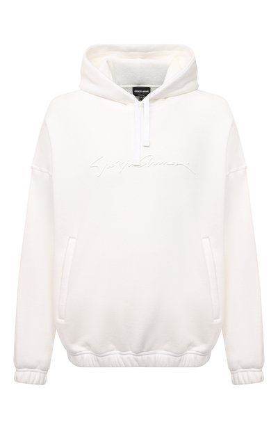 Для худи из весенне-летней коллекции Джорджио Армани выбрал базовый белый цвет, но от этого оно не стало выглядеть просто. Индивидуальность модели добавил рельефный декор в виде размашистого автографа дизайнера. Изделие с глубоким регулируемым капюшоном выполнили из плотного хлопкового трикотажа с неброским жаккардовым узором.