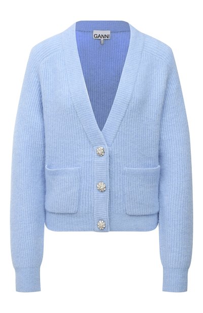 Голубой кардиган с глубоким V-образным вырезом одинаково комфортно носить и поверх блузы, и на голое тело. Пушистая полушерстяная пряжа настолько мягкая, легкая и приятная на ощупь, что не раздражает даже нежную кожу. Чтобы изделие из такого деликатного материала не деформировалось со временем, в состав добавили прочный тонкий нейлон. Более нарядной модель из весенне-летней коллекции делают три крупные пуговицы из сверкающих кристаллов.